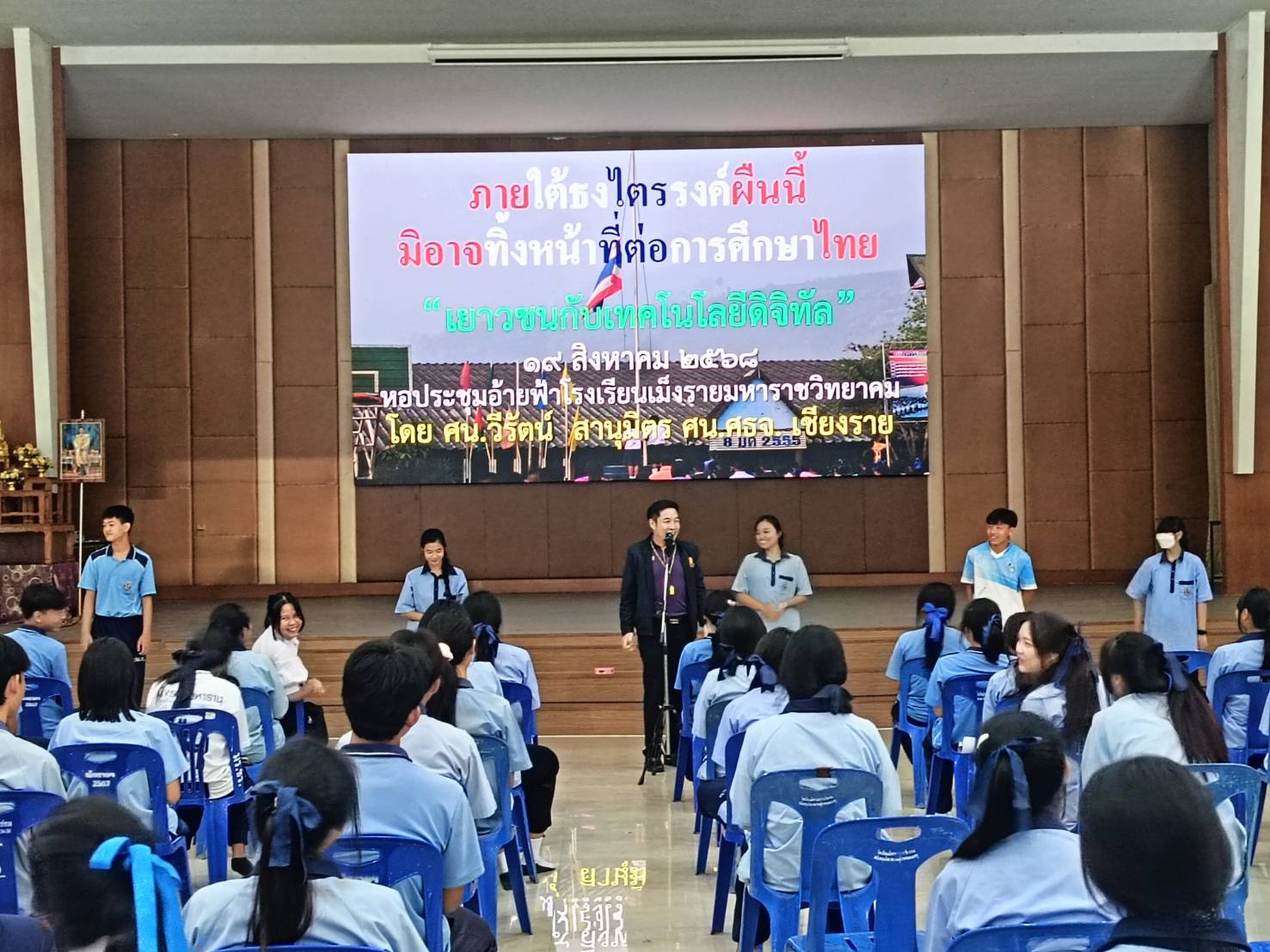วันที่ 19 สิงหาคม 2568 โรงเรียนเม็งรายมหาราชวิทยาคมจัดกิจกรรมการอบรม “นักสร้างสรรค์ดิจิทัลรุ่นเยาว์” ให้กับนักเรียนระดับชั้นมัธยมศึกษาปีที่ 5 ณ หอประชุมอ้ายฟ้า การจัดอบรมครั้งนี้มีวัตถุประสงค์เพื่อให้นักเรียนสามารถใช้เทคโนโลยีในการสืบค้นข้อมูล สร้างและนำเสนอผลงานได้อย่างอย่างสร้างสรรค์ ปลอดภัย และมีจริยธรรม และสามารถทำงานร่วมกับผู้อื่นผ่านเครื่องมือดิจิทัลได้