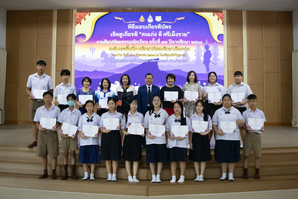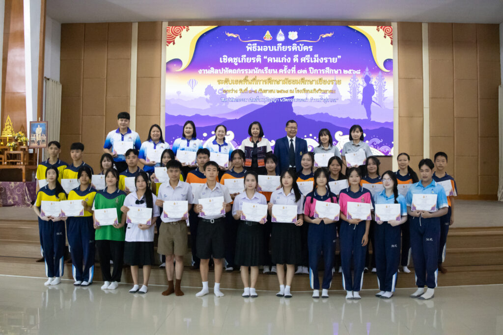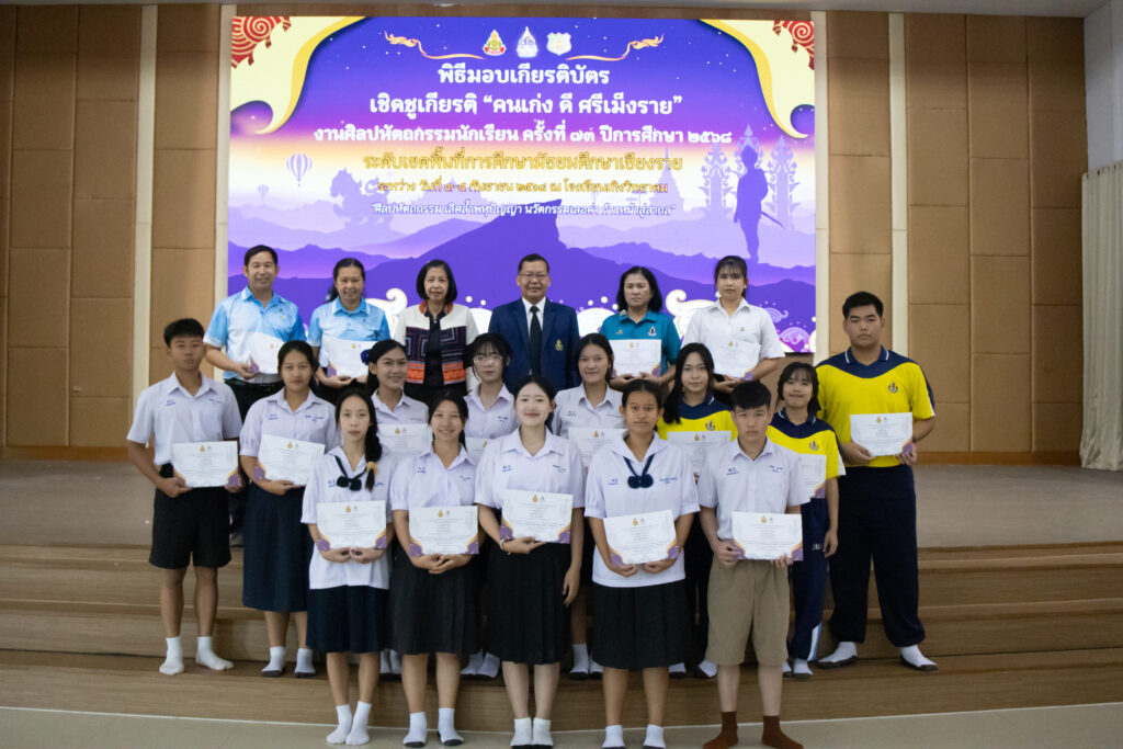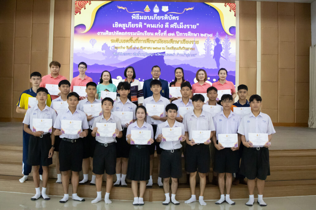 วันพุธที่ 10 กันยายน 2568 นายประยูร ชาติชำนาญ ผู้อำนวยการโรงเรียนเม็งรายมหาราชวิทยาคม ให้เกียรติมอบเกียรติบัตรแสดงความชื่นชมยินดีกับตัวแทนนักเรียน กลุ่มสาระคณิตศาสตร์, วิทยาศาสตร์, คอมพิวเตอร์ และสังคมศึกษา ที่เข้าร่วมการแข่งขันทักษะวิชาการงานศิลปหัตถกรรมนักเรียนครั้งที่ 73 ระดับเขตพื้นทีการศึกษามัธยมศึกษาเชียงราย ประจำปีการศึกษา 2568 ระหว่างวันที่ 3-5 กันยายน 2568 ณ หอประชุมอ้ายฟ้า โรงเรียนเม็งรายมหาราชวิทยาคม