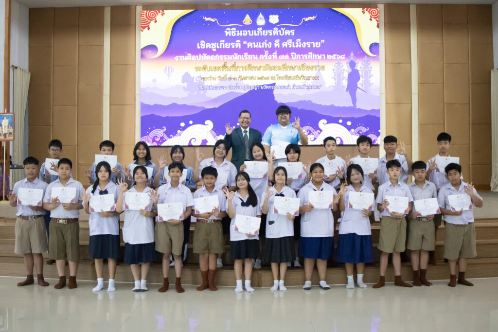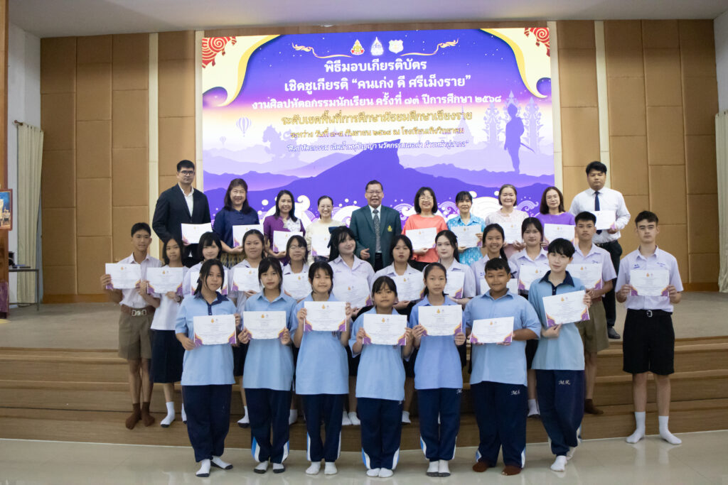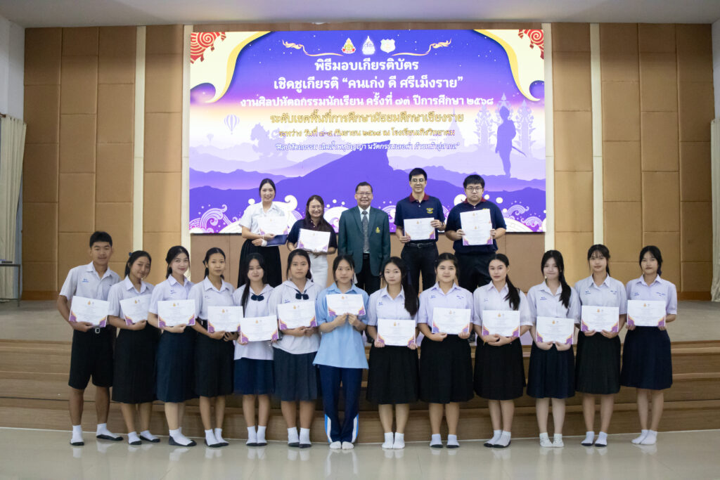 วันพฤหัสบดีที่ 11 กันยายน 2568 นายประยูร ชาติชำนาญ ผู้อำนวยการโรงเรียนเม็งรายมหาราชวิทยาคม ให้เกียรติมอบเกียรติบัตรแสดงความชื่นชมยินดีกับตัวแทนนักเรียน กลุ่มสาระภาษาไทย, ภาษาอังกฤษ, ภาษาจีน และดนตรี ที่เข้าร่วมการแข่งขันทักษะวิชาการงานศิลปหัตถกรรมนักเรียนครั้งที่ 73 ระดับเขตพื้นทีการศึกษามัธยมศึกษาเชียงราย ประจำปีการศึกษา 2568 ระหว่างวันที่ 3-5 กันยายน 2568 ณ หอประชุมอ้ายฟ้า โรงเรียนเม็งรายมหาราชวิทยาคม