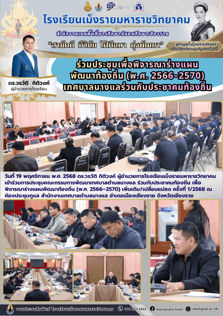 ดร.วรวัติ กิติวงค์ ผู้อำนวยการโรงเรียนเม็งรายมหาราชวิทยาคม เข้าร่วมการประชุมคณะกรรมการพัฒนาเทศบาลตำบลนางแล ร่วมกับประชาคมท้องถิ่น เพื่อพิจารณาร่างแผนพัฒนาท้องถิ่น (พ.ศ. 2566–2570) เพิ่มเติม/เปลี่ยนแปลง ครั้งที่ 1/2568 ณ ห้องประชุมภูแล สำนักงานเทศบาลตำบลนางแล อำเภอเมืองเชียงราย จังหวัดเชียงราย