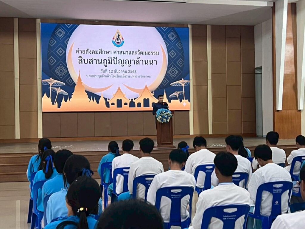วันศุกร์ที่ 12 ธันวาคม 2568 ดร.วรวัติ กิติวงค์ ผู้อำนวยการโรงเรียนเม็งรายมหาราชวิทยาคม ให้เกียรติเป็นประธานในพิธีเปิดค่ายสังคมศึกษาศาสนาและวัฒนธรรม “สืบสานภูมิปัญญาล้านนา” กิจกรรมดังกล่าวจัดขึ้น ณ หอประชุมอ้ายฟ้า โรงเรียนเม็งรายมหาราชวิทยาคม เพื่อปลูกฝังคุณธรรม จริยธรรม เสริมสร้างความภาคภูมิใจในรากเหง้าและอัตลักษณ์ท้องถิ่นล้านนา พร้อมทั้งเปิดโอกาสให้นักเรียนได้เรียนรู้ประวัติศาสตร์ วัฒนธรรม และวิถีชีวิตชุมชนผ่านกิจกรรมเชิงสร้างสรรค์และลงมือปฏิบัติจริง