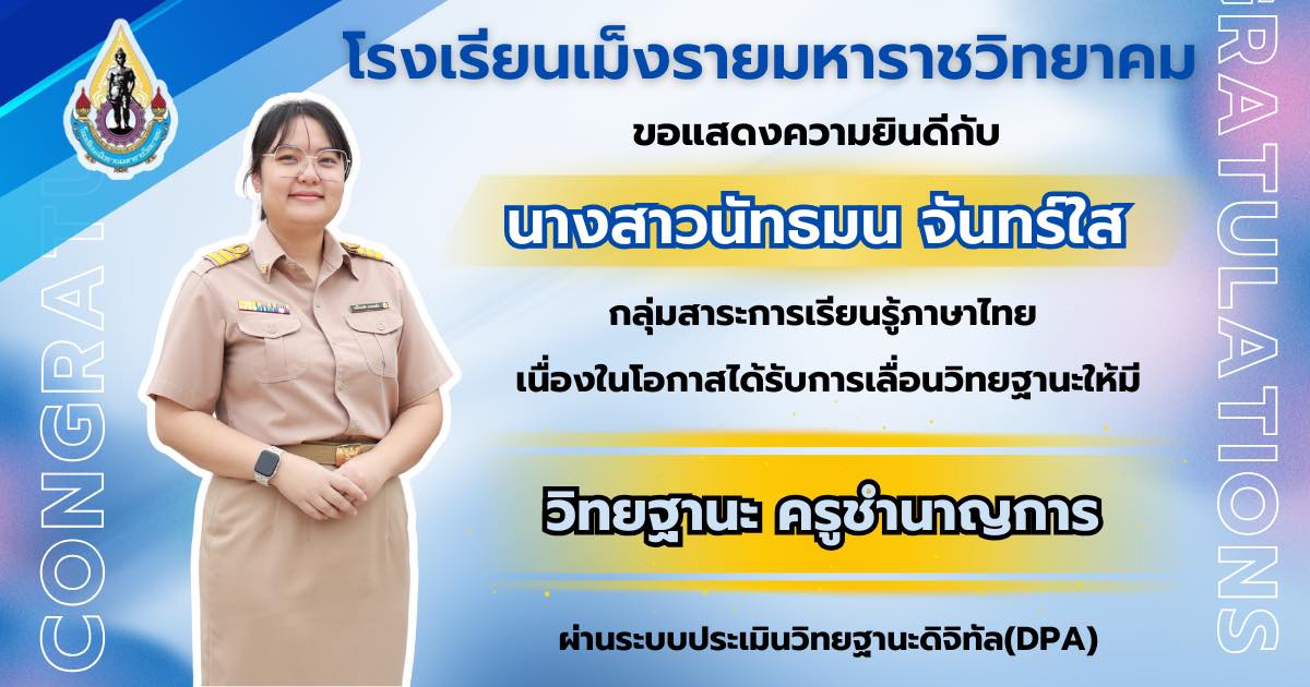 แสดงความยินดีกับ ครูนัทธมน จันทร์ใส ได้รับการเลื่อนวิทยฐานะครูชำนาญการ By admin29/01/202608/02/2026รอบรั้วฟ้าขาว โรงเรียนเม็งรามหาราชวิทยาคม ขอแสดงความยินดีกับ ครูนัทธมน จันทร์ใส ได้รับการเลื่อนวิทยฐานะครูชำนาญการ กลุ่มสาระการเรียนรู้ภาษาไทย