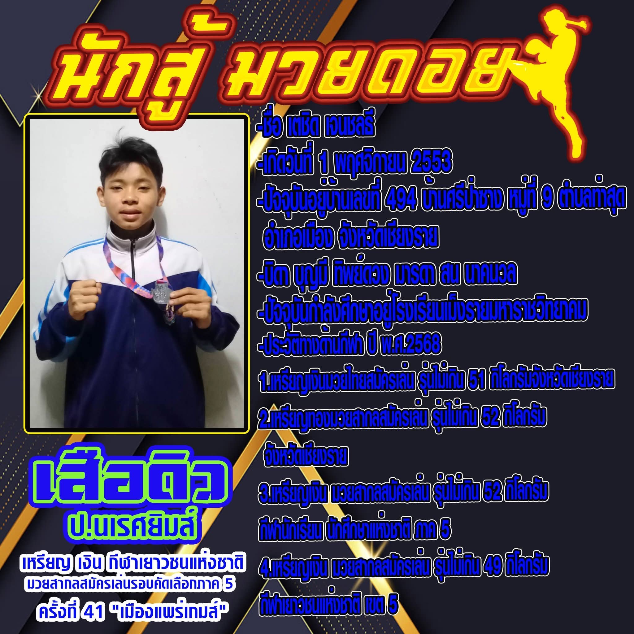 แสดงความยินดีกับ นายเตชิด เจนชลธี ได้รับรางวัลเหรียญเงินมวยสากลสมัครเล่น By admin30/01/202608/02/2026รอบรั้วฟ้าขาว โรงเรียนเม็งรายมหาราชวิทยาคม ขอแสดงความยินดีกับ นายเตชิด เจนชลธี ได้รับรางวัลเหรียญเงินมวยสากลสมัครเล่น รุุ่นไม่เกิน 49 กิโลกรัม กีฬาเยาวชนแห่งชาติรอบคัดเลือกภาค 5 ครั้งที่ 41 “เมืองแพร่เกมส์”